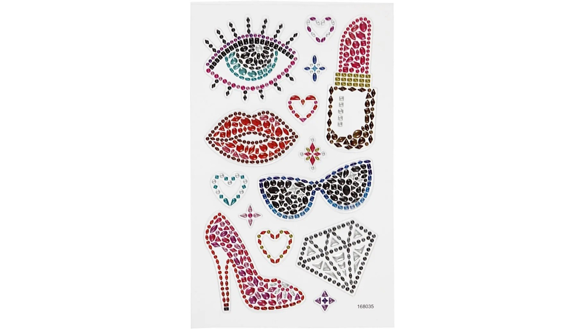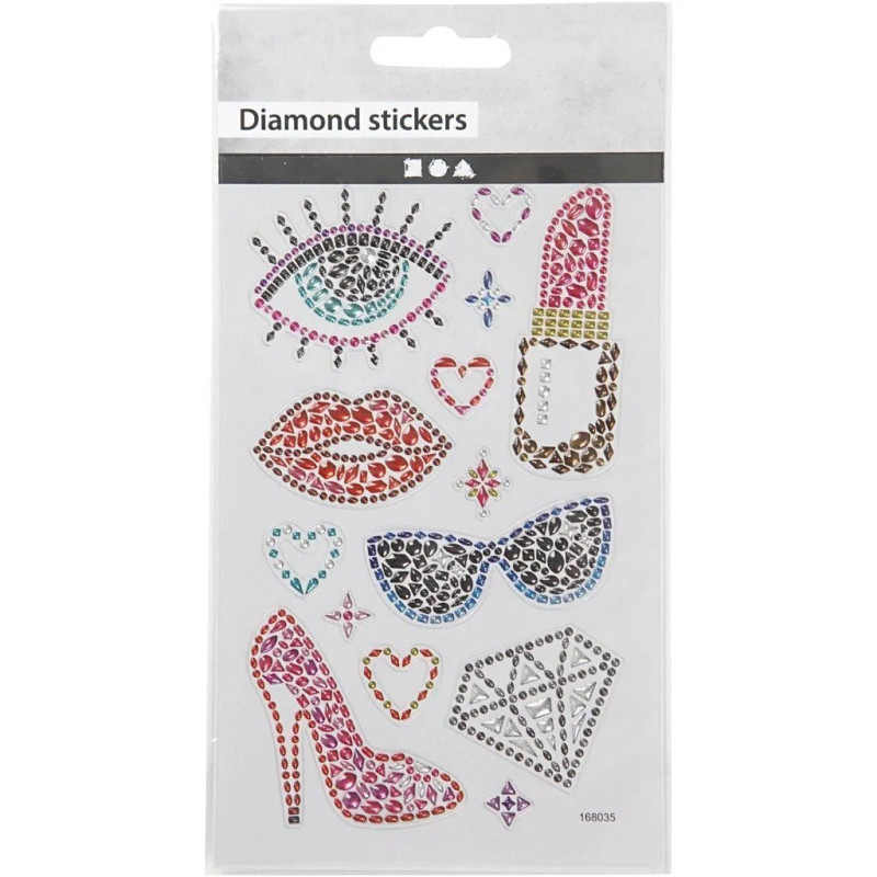 Dekoracyjne naklejki diamentowe z wzorami z dżetów, przeznaczone do kreatywnych projektów plastycznych i rękodzielniczych. Wyposażone w klej odpowiedni do papieru.