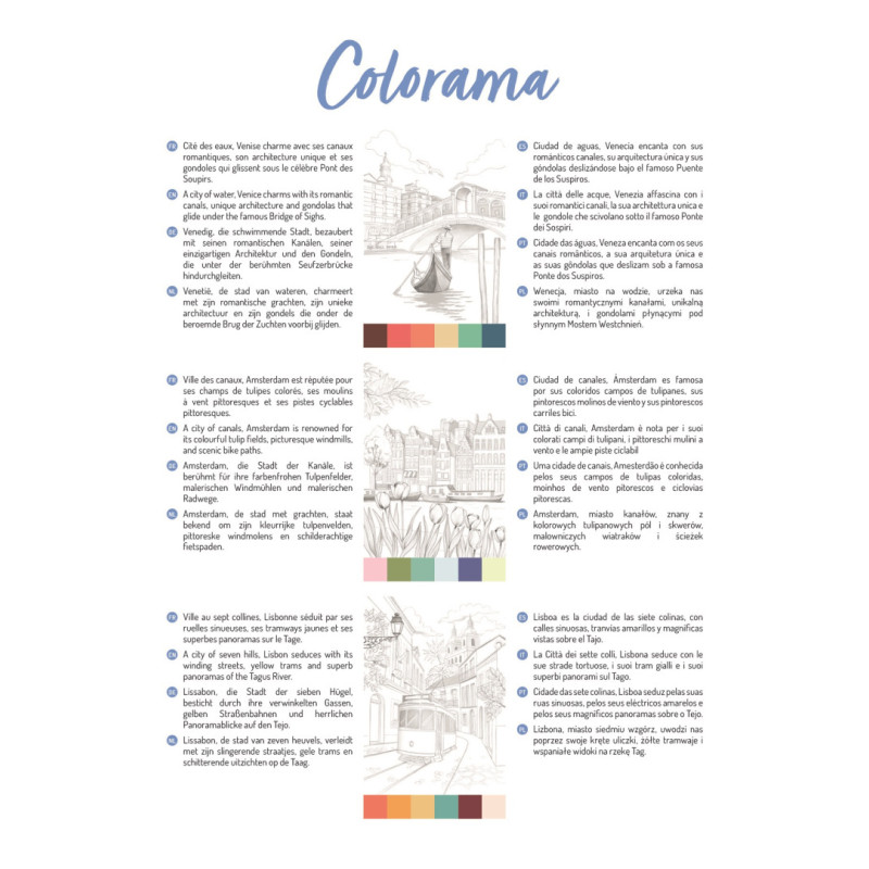 W albumie znajduje się 6 unikalnych rysunków powtórzonych trzykrotnie, co pozwala eksperymentować z różnymi paletami kolorystycznymi. Na pierwszej kartce zamieszczono inspirujące propozycje kolorystyczne do każdej ilustracji.