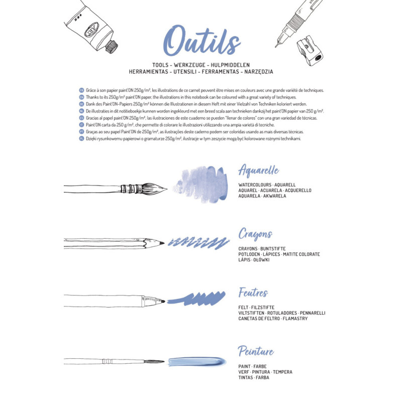 Album został wydany przez renomowaną markę Clairefontaine i zawiera wysokiej jakości papier Paint’ON® o gramaturze 250 g/m², o lekko ziarnistej strukturze. Papier umożliwia stosowanie różnych technik mix-media, takich jak farby akrylowe, akwarele, tusze, kredki czy flamastry.